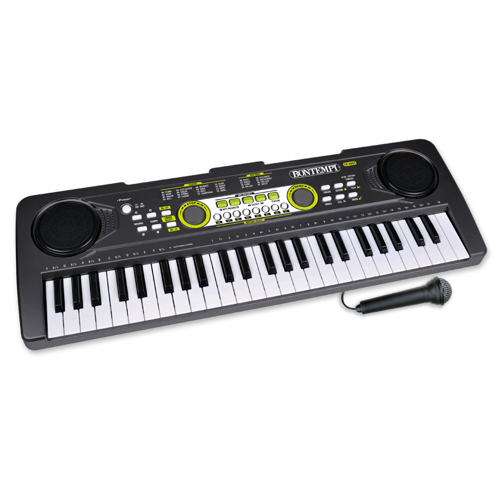 Tastiera digitale a 49 tasti • 6 brani dimostrativi • 16 Suoni • 8 Ritmi • Funzione di registrazione/riproduzione • Accordi di facile gestione (Auto bass chord) • Effetti: Echo, Sustain, Vibrato • Controllo del volume • Regolazione del tempo • Lettura di brani MP3 contenuti in una chiavetta USB • Controlli del volume e della sequenza per brani MP3 • Presa per cavo USB Type-C (in dotazione) o per adattatore di rete (non in dotazione) • Spegnimento automatico • Alimentazione: tramite cavo USB Type-C (incluso) da collegare a power bank, PC, caricabatteria del telefono ecc. (non incluso) • Presa per microfono a condensatore (incluso) • Presa USB per chiavetta USB (non inclusa) •