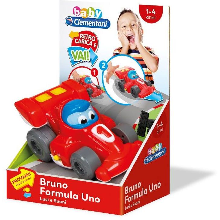 Baby Clementoni auto Bruno Formula -Una grintosa auto da corsa a retrocarica per sfrecciare verso il divertimento. Premendo la testa del pilota si attivano gli effetti sonori di una vera formula 1 e le luci lampeggiano davvero facendo divertire il bambino.