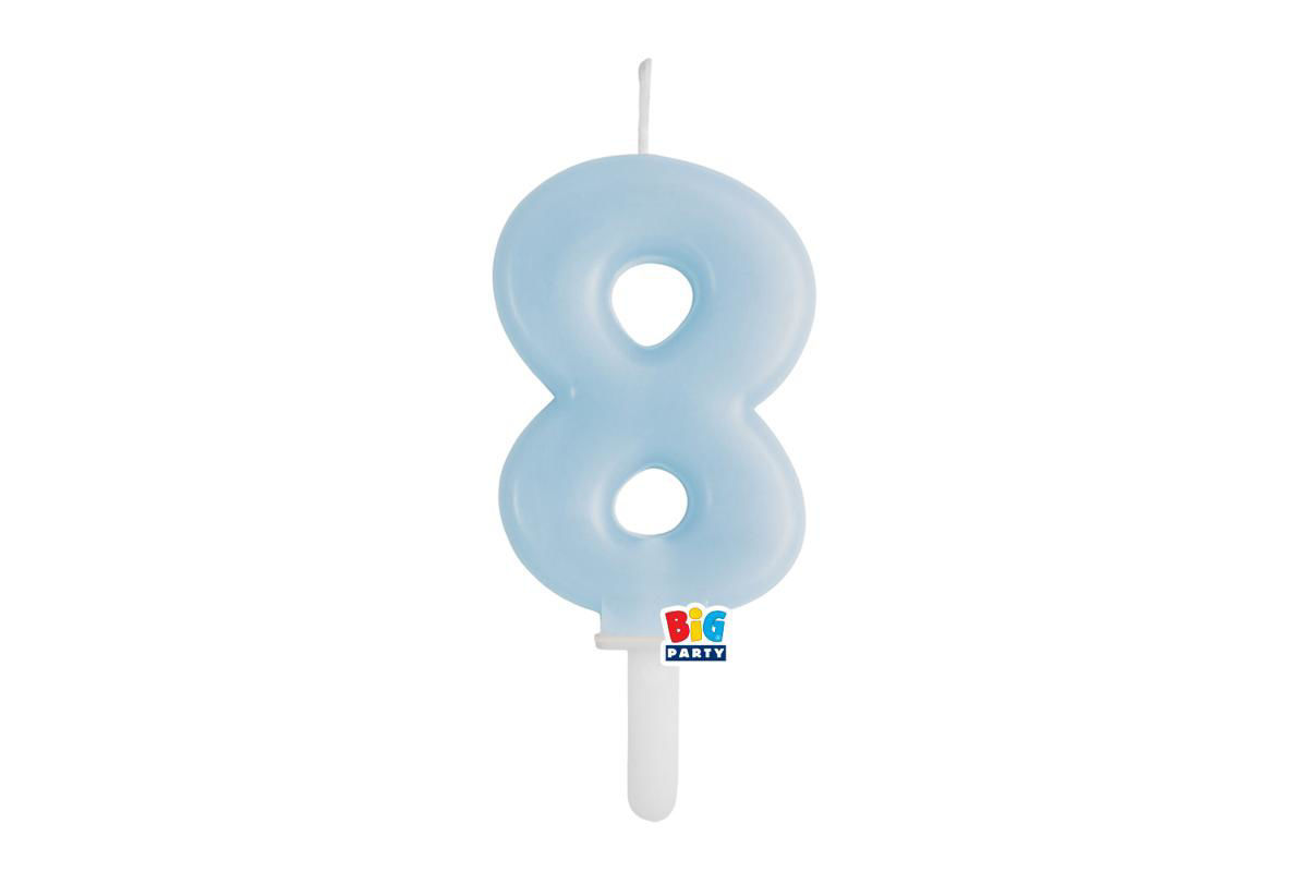 Candelina numero 8 linea Tiny Plump colore celeste, perfetta per decorare torte di compleanno con uno stile delicato e moderno.