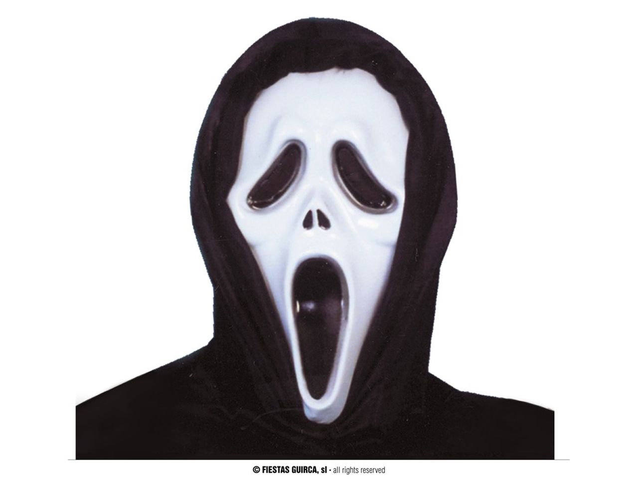 LA MASCHERA SCREAM DI UNO DEI PIU’ FAMOSI ASSASSINI , IN PVC CON COPRICAPO IN TULLE NERO.