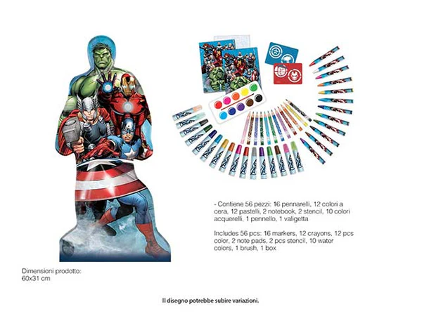 Valigetta a forma di Avengers, set 56 pezzi, 16 pennarelli, 12 colori a cera, 12 pastelli, 2 notebook, 2 stencil, 10 colori acquerelli, 1 pennello, 1 valigetta